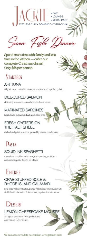 This Christmas Eve, Jackie invites you to savor the timeless Feast of the Seven Fishes—reimagined with bold flavors, refined technique, and holiday charm.
