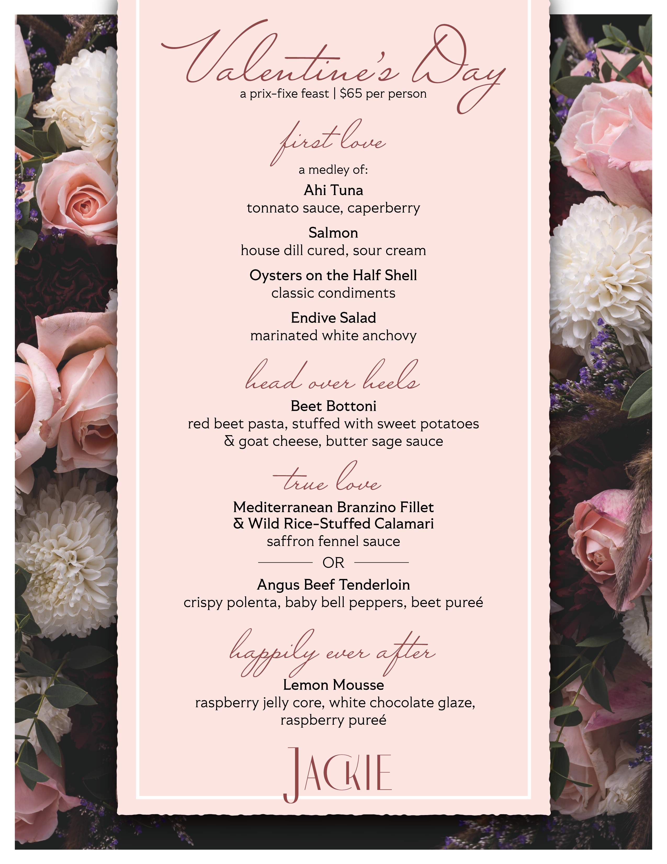 Celebrate love with a special Valentine’s Day prix-fixe dinner, thoughtfully designed by our Executive Chef Domenico Cornacchia for an intimate evening at Jackie. This exclusive multi-course menu is built around indulgence, balance, and a touch of romance — meant to be shared and savored.
