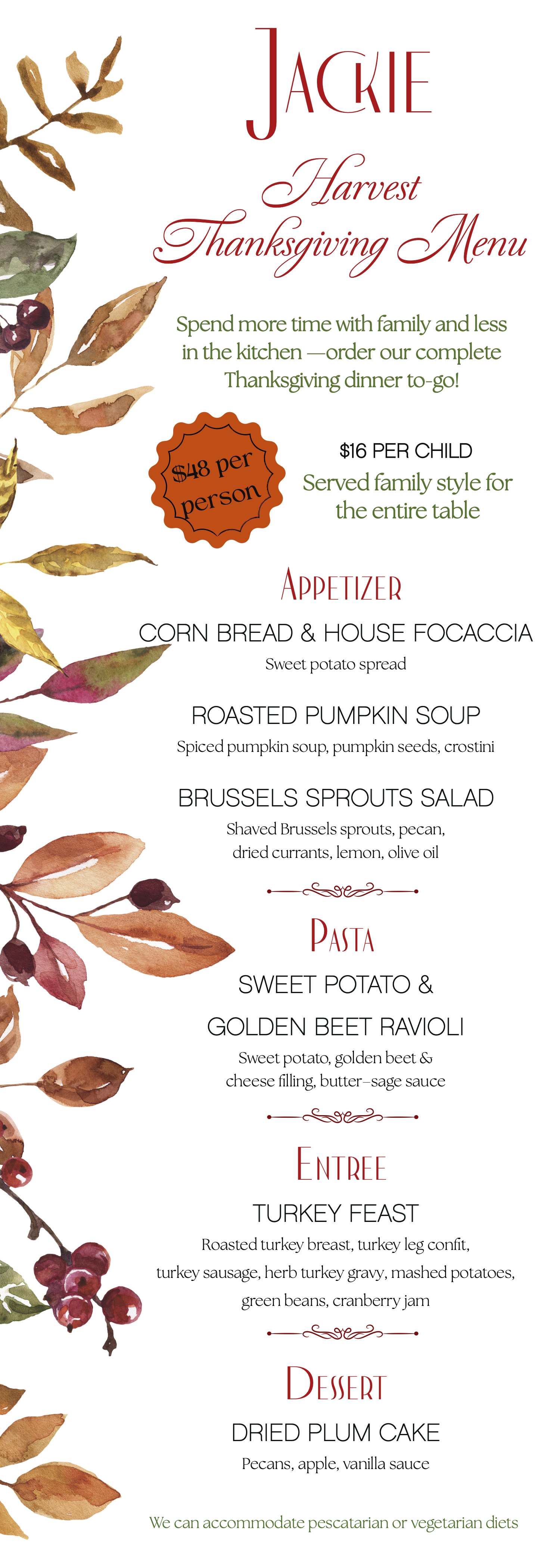 This Thanksgiving, gather at Jackie for a warm, festive celebration of comfort food done right. Our Thanksgiving Feast brings together all your holiday favorites—think juicy roasted turkey, velvety mashed potatoes, seasonal sides, and decadent desserts—each elevated with Jackie’s signature modern flair.