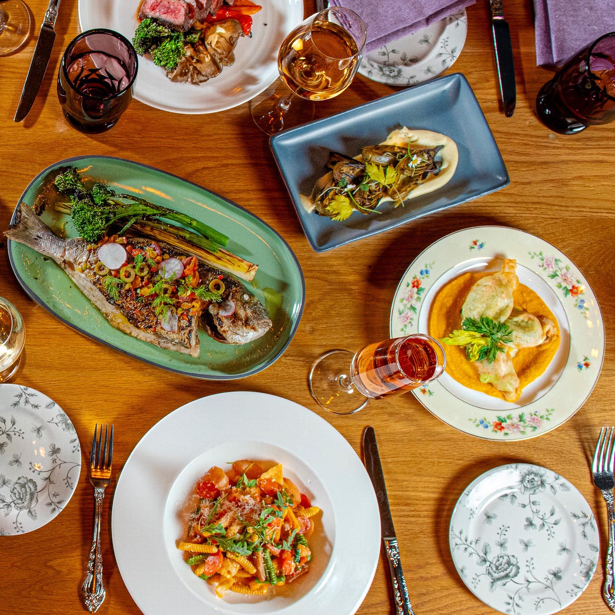 Skip the full tasting arc. Two starters split at the table, one shared pasta, dessert if there is time. The kitchen paces for a 6:45 departure without anyone feeling rushed.